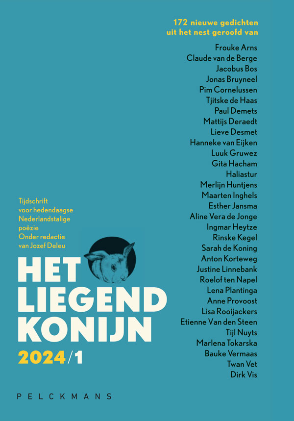 Toen viel op Koningsdag het poëzietijdschrift Het Liegend Konijn met een plof op de mat. Ik zette het gaspit onder de espressopot laag, nam het uit zijn kartonnen verpakking. Al jaren komt Het Liegend Konijn tweemaal per jaar door de brievenbus mijn huis binnen. Er zijn gewoontes ontstaan. Eerst lees ik alle namen op het voorplat (tweeëndertig). Ik lees ze hardop. Tel de lettergrepen als zoek ik het ritme van een gedicht op mijn vingers: Frouke Arns (3)/ Claude van de Berge (6) / Jacobus Bos (4) / Jonas Bruyneel (4) / Pim Cornelussen (5) / Tjitske de Haas (4) / Paul Demets (3) / Mattijs Deraedt (4)/ Lieve Desmet (4)/ Hanneke van Eijken (6)/ Luuk Gruwez (3) enzovoort. Alles aan een poeziëtijdschrift wordt eenvoudigweg poëzie.